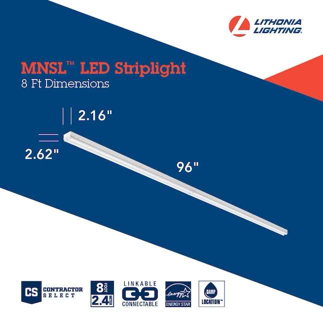 La tira de luz LED Lithonia Lighting de 8 pies y 2 luces de color blanco frío de 4000 K ofrece una apariencia tradicional al tiempo que incorpora la última tecnología LED. Esta tira de luz es ideal para aplicaciones comerciales, minoristas, de oficina, de almacén y de exhibición.