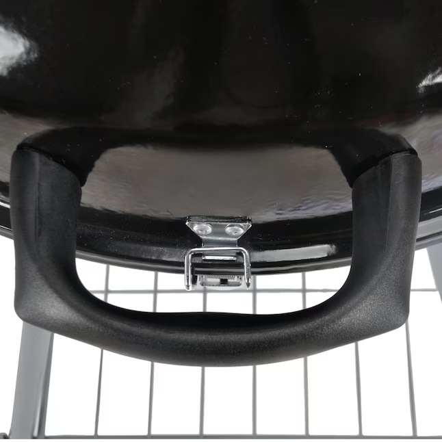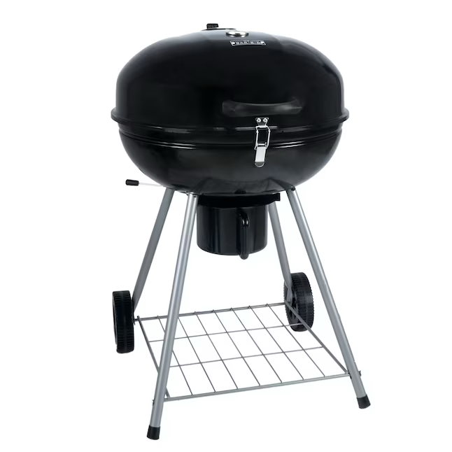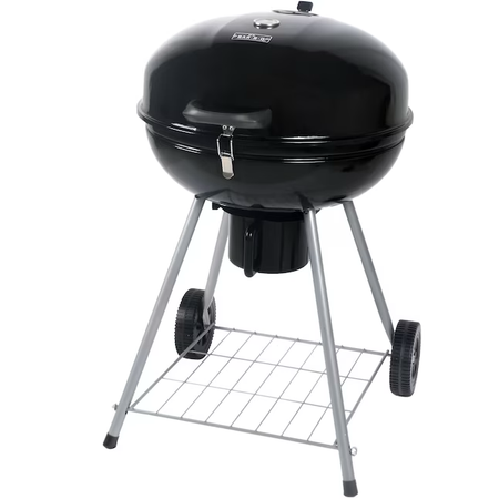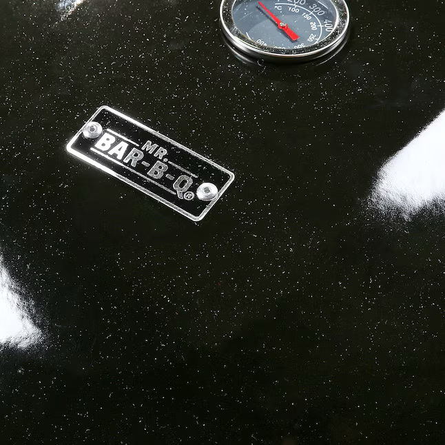 La parrilla de carbón Mr. Bar-BQ de 22 pulgadas tiene un área de cocción total de 540 pies cuadrados y cocina hasta 27 hamburguesas a la vez. Medidor de temperatura incorporado y salidas de aire ajustables para control de temperatura. El estante de almacenamiento inferior ofrece espacio adicional. Las ruedas facilitan el transporte para su próximo evento.