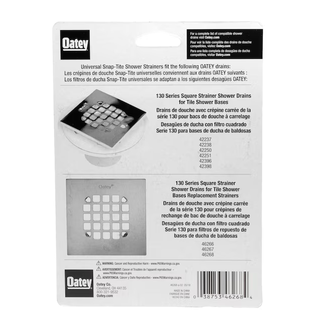 Los coladores con acabado de diseñador Snap-Tite universales de 4-1/4 pulgadas Oatey® están diseñados para brindar un acabado decorativo a los desagües de ducha residenciales con cualquier tapa de drenaje redonda de 4-1/4 pulgadas. Los filtros Snap-Tite permiten flexibilidad para combinar con muchos acabados sin reemplazar todo el conjunto de drenaje. Se encajan fácilmente y se pueden quitar rápidamente si es necesario limpiar el drenaje. Los productos Oatey se han ganado la confianza de los profesionales de plomería durante más de 100 años.