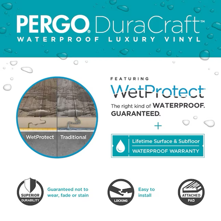 • La innovadora tecnología WetProtect proporciona impermeabilización de cobertura total desde la superficie hasta el subsuelo para obtener el tipo correcto de impermeabilización. GARANTIZADO contra el desgaste, la decoloración o las manchas y una resistencia superior a las abolladuras y los rayones.