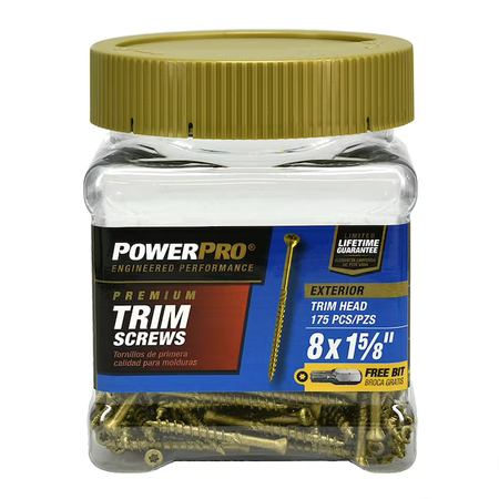 Los tornillos de moldura exterior Power Pro Premium incluyen una garantía limitada de por vida contra el óxido y la corrosión.