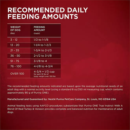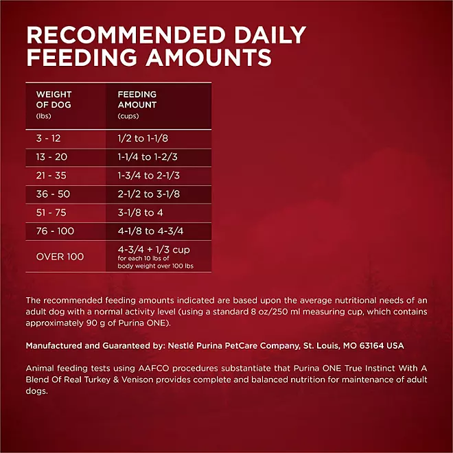 Con una nutrición natural respaldada por investigaciones y elaborada por una marca recomendada por veterinarios, Purina ONE SmartBlend True Instinct Adult Dry Dog Food, Real Turkey & Venison (40 lbs.) le permite volver a alimentar a su perro de la forma prevista por la naturaleza.