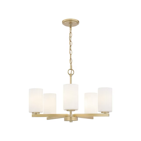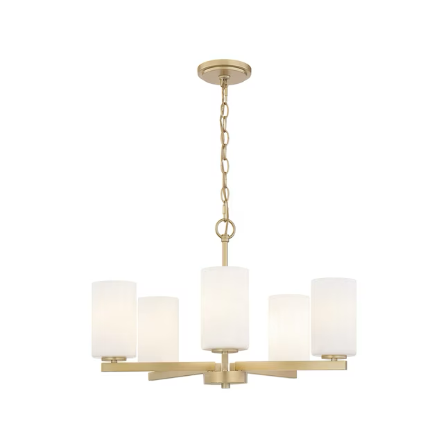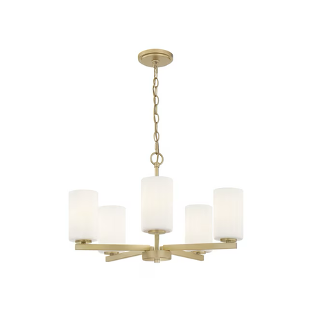 Inspirada en la estética del diseño moderno de mediados de siglo, la lámpara de araña Vista de 5 luces es el complemento perfecto para su espacio. El llamativo diseño tiene un acabado en un elegante oro nouveau que se complementa maravillosamente con 5 pantallas cilíndricas individuales. Ubicadas sobre la base circular similar a un candelabro, las pantallas de vidrio ópalo grabado proyectan un suave brillo ambiental. Compre el resto de la colección Vista para obtener combinaciones de colores adicionales y piezas de diseño similar.