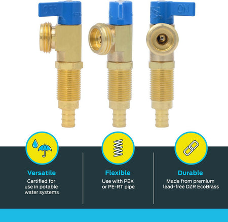 Cierre rápido y seguro del suministro de agua para lavadoras. Utiliza un anillo de engarce o abrazadera para conectar con tubería PEX. Viene en colores coordinados para suministros de agua fría y caliente. Certificado para uso en agua potable y sistemas de calefacción hidrónica.