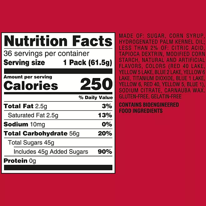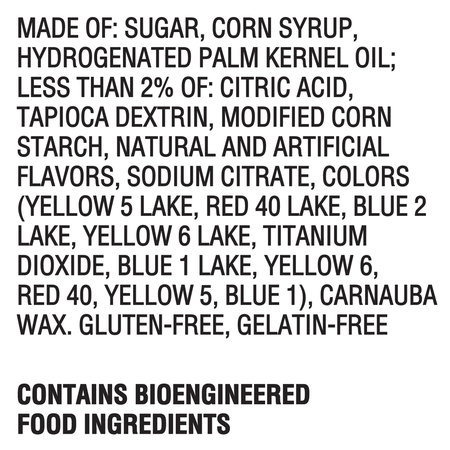 Ingredientes: Azúcar, jarabe de maíz, aceite de palmiste hidrogenado, menos del 2% de: ácido cítrico, dextrina de tapioca, almidón de maíz modificado, sabores naturales y artificiales, colorantes (laca roja 40, dióxido de titanio, roja 40, laca amarilla 5, amarilla 5, laca amarilla 6, laca azul 2, azul 1, laca azul 1), citrato de sodio, cera de carnauba.