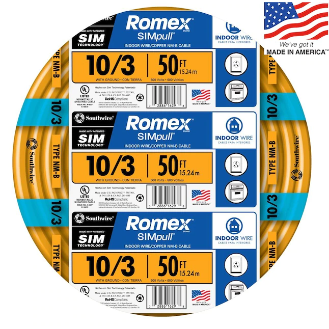 Southwire Romex SIMpull 50 pies 10 / 3 Cable sólido no metálico para interiores