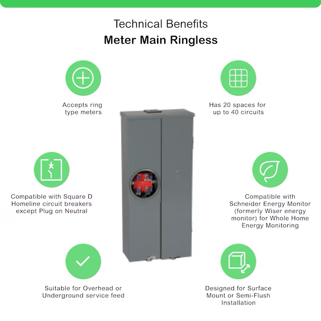 El centro de carga del interruptor principal y el zócalo del medidor combinado Square D, 200 amperios, 20 espacios, 40 circuitos, es adecuado para su uso como dispositivo de entrada de servicio combinado (CSED) y es una unidad tipo anillo.