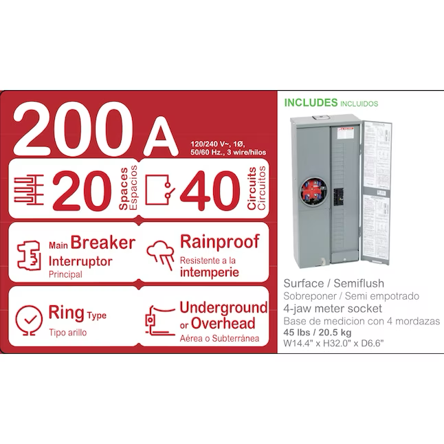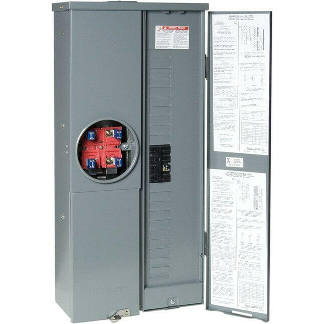 Centro de carga combinado con medidor de disyuntor principal para exteriores Square D, 200 amperios, 20 espacios, 40 circuitos