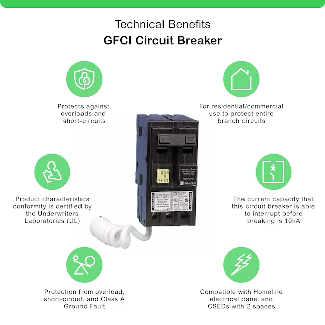 - Specifications Voltaje del disyuntor 240 Fase Monofásico (120/240) Protección de falla a tierra Sin autoprueba Neutro enchufable No Listado de amplificadores de interrupción (amperios) 10000 Protección contra sobretensiones No Número de polos 2