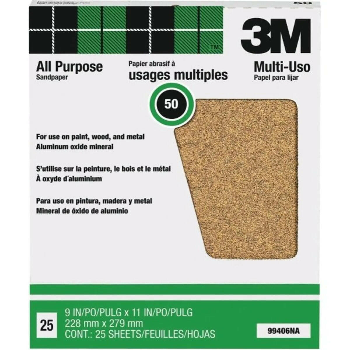 3M 9" x 11" All Purpose 50D Alox Sandpaper - 25 Pack