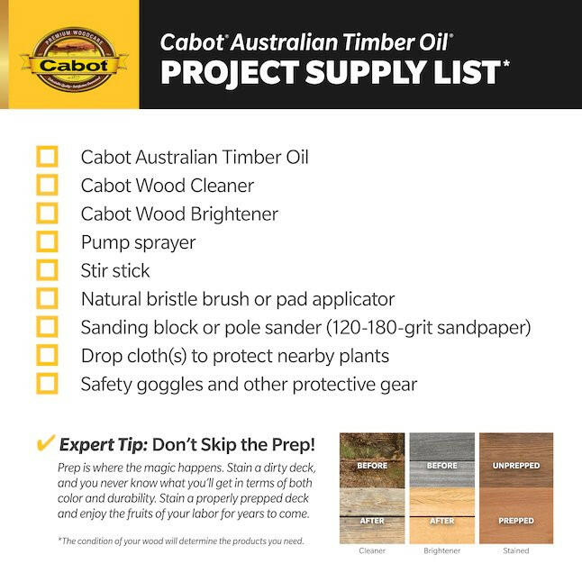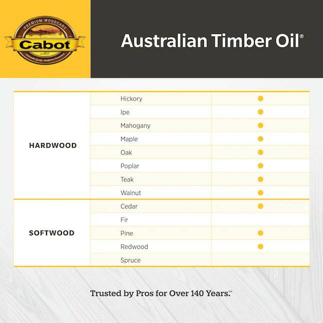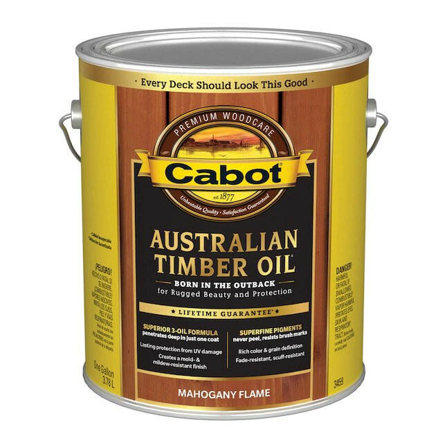 Cabot Australian Timber Oil for decks, siding, railings and outdoor furniture is a unique blend of oils originally formulated to protect dense tallowwood, cambara and merbau from the extreme Australian exposures. Australian Timber Oil penetrates deep into the dense, resin-rich woods to accentuate natural wood depth and patina. Containing a precise blend of superb-grade linseed oil for maximum penetration, long-oil alkyds for durability and pure South American tung oil for color depth and water repellency, Australian Timber Oil delivers three-way oil protection and a beautiful hardwood stain. In addition, complex translucent iron oxide pigments are added to ensure a lasting U.V.-absorbing surface rich with color and dimension. The result after years of development is an advanced-technology treatment of unrivaled performance designed to protect your exotic wood surfaces like never before.