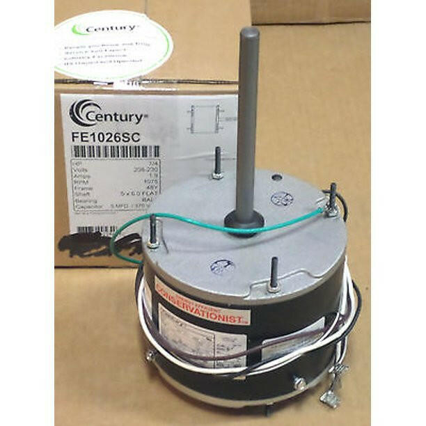 Century Condenser Motor FE1026SCMotor Specifications:1/4 HorsePower208-230 Volts Single Phase1.9 Amps1075 RPMMounts Shaft Up or Horizontal5-5/8" Diameter1/2" x 6" Shaft (can be cut down with a hacksaw if needed)Mounts with belly band strap or with 4 studs, studs measure 3-3/4" apart center to centerBall BearingSingle SpeedElectrically Reversible (by switching color coded wires)Thermally ProtectedRequires a 5 mfd 370 vac Start Capacitor (Not included)