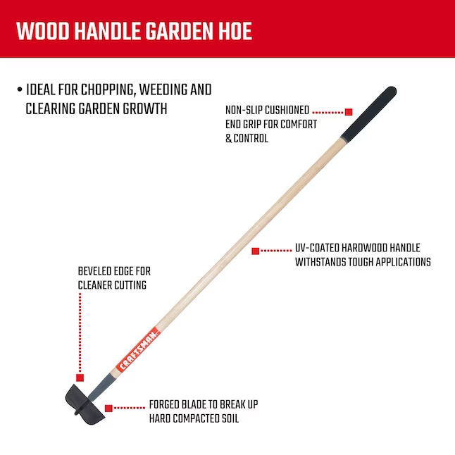 The CRAFTSMAN wood handle garden hoe is ideal for chopping, weeding and clearing garden growth. The beveled blade edge results in a cleaner cut, while the forged blade head and steel connection add durability to the garden hoe. The CRAFTSMAN® garden hoe is a must own for any gardener completing fall clean-up or building a garden bed.