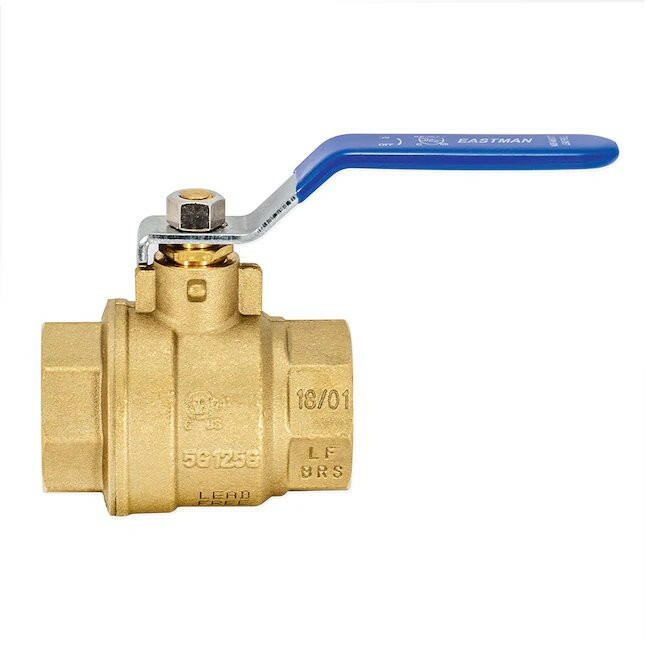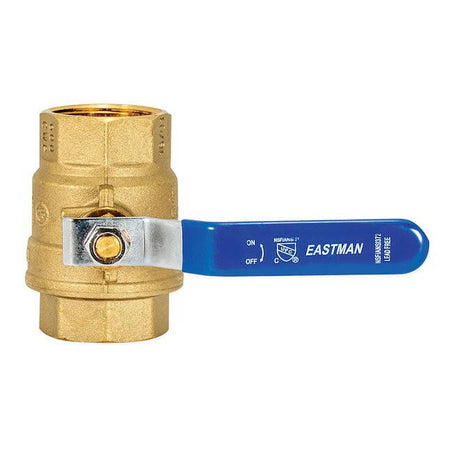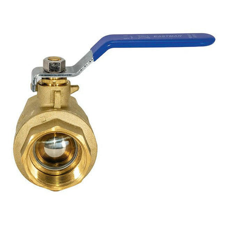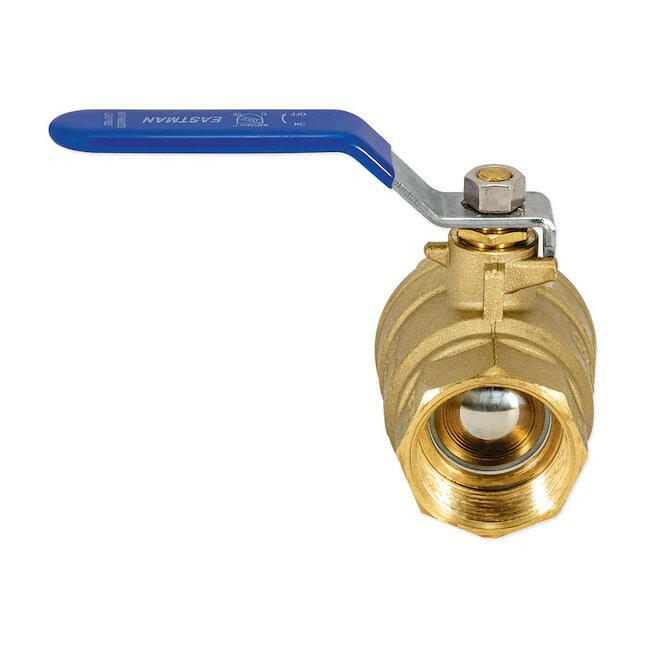 This Eastman® ball valve is a full port valve configured for a 1-1/4-inch iron pipe size connection. This valve is built with heavy-duty brass for durability and strength. Its full port design allows for maximum flow and minimum pressure drops. It is equipped with a vinyl-coated steel lever handle, enabling an easy grip for flow control.