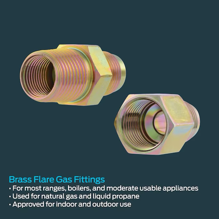 The Eastman™ 1/2-IN OD gas fittings adapt to most water heater and dryer inlets. Flare fitting connects to the gas connector nut. Male fitting connects to the gas appliance inlet, gas ball valve or gas supply stub out. Includes: (1) - 1/2-IN OD Flare x 1/2-IN FIP fitting, (1) 1/2-IN OD FLARE X 1/2-IN MIP (TAPPED 3/8-IN FIP) fitting. DO NOT APPLY THREAD SEALANT TO FLARED ENDS!