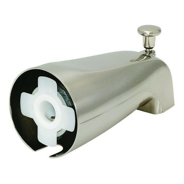 This slide-on diverter spout features a universal design that is compatible with a variety of decorating styles. This spout is great for replacement and remodeling applications or new installations. The spout is built with zinc with a brushed nickel finish for durability and corrosion resistance. This slide-on diverter spout features a universal design that is compatible with a variety of decorating styles. This spout is great for replacement and remodeling applications or new installations. The spout is built with zinc with a brushed nickel finish for durability and corrosion resistance. It is designed to be installed on a 1/2-inch copper tube that slides into place, the set screw is tightened to keep it in place.