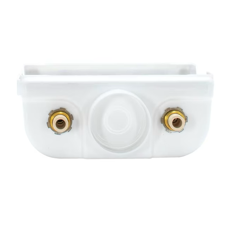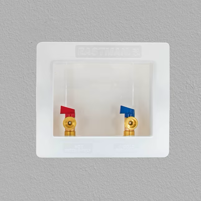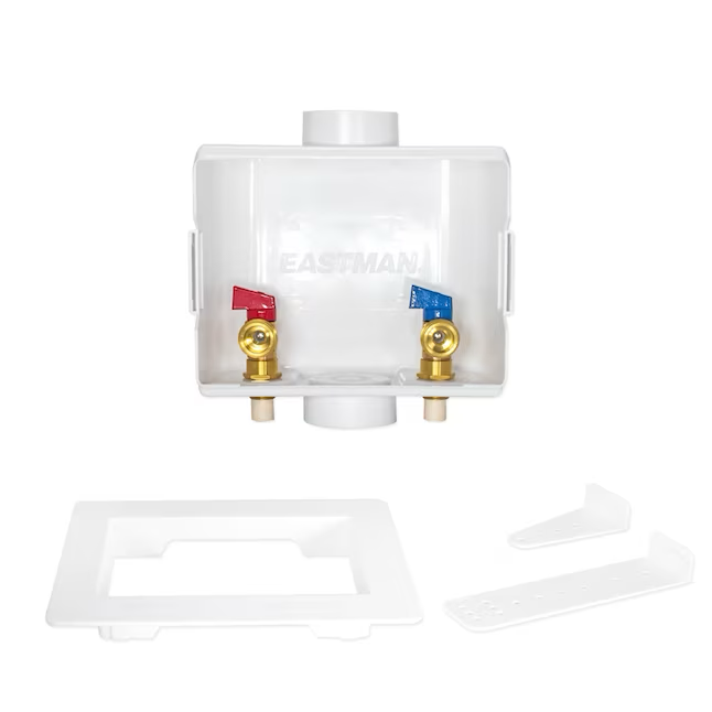 The Eastman® center drain washing machine outlet box provides a safe water supply installation for washing machines. It is a one-piece box built with high-impact non-corrosive plastic and a center drain. It has a recessed design that accommodates 1-inch drywall. It comes with a pre-installed support bracket, a faceplate cover and 1/4-turn hot and cold ball valves for shut-off during maintenance. This washing machine outlet box has a 1/2-inch CPVC inlet connection and a 3/4-inch male hose thread outlet. It is designed for residential applications. UPC approved.