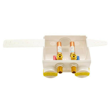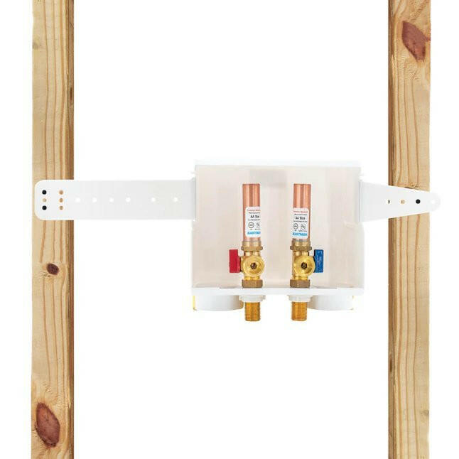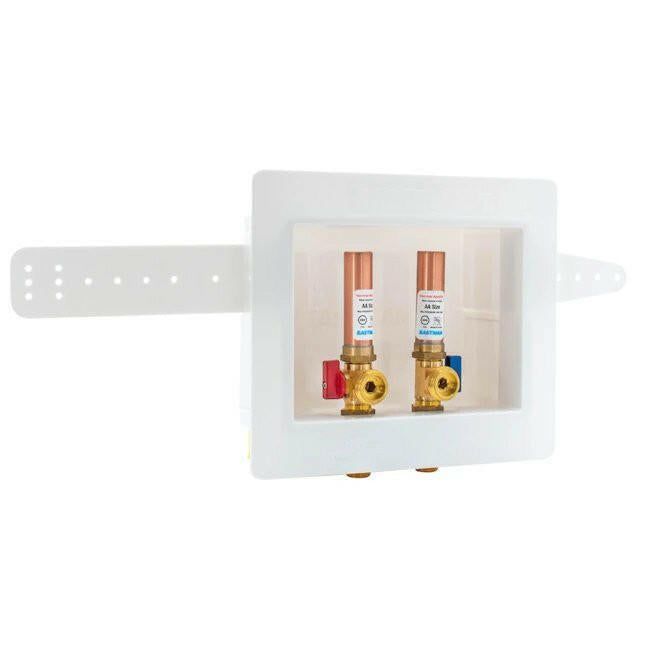 The Eastman® dual drain washing machine outlet box provides a safe water supply installation for washing machines. It is a one-piece box built with high-impact non-corrosive plastic. It has a recessed design that accommodates 1-inch drywall. It comes with a pre-installed support bracket, a faceplate cover and 1/4-turn hot and cold ball valves for shut-off during maintenance, the valves include hammer arrestors that prevent pipes from shaking and pounding. This washing machine outlet box has a 1/2-inch sweat inlet connection and a 3/4-inch male hose thread outlet. It is designed for residential applications. UPC approved.
