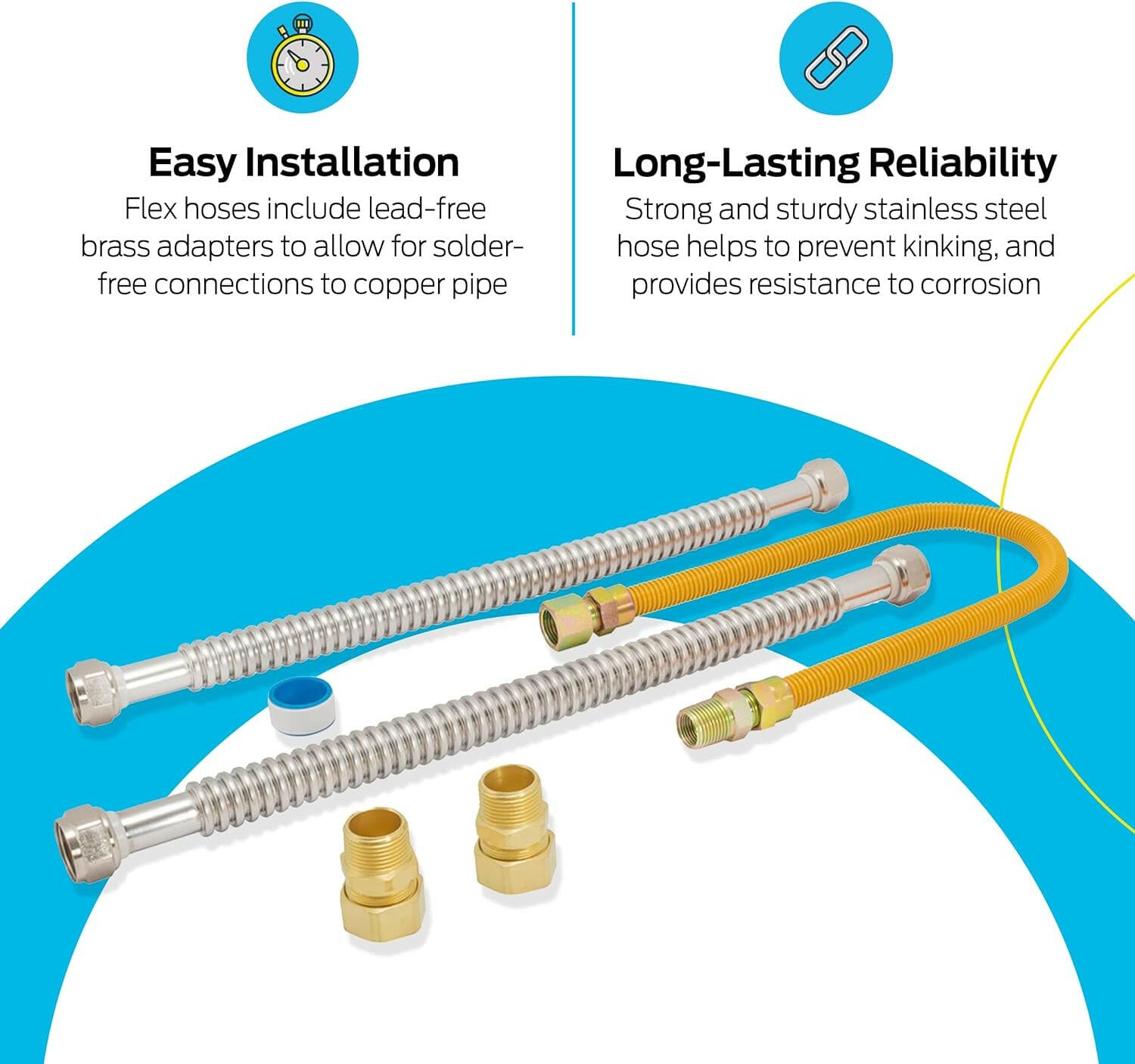 Installing or replacing the connectors of your water heater is easy with the Eastman water heater installation kit. This kit will save you shopping time by including all the necessary components that you need for your water heater installation, no need to look individually for each part!