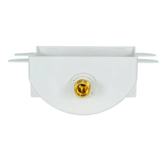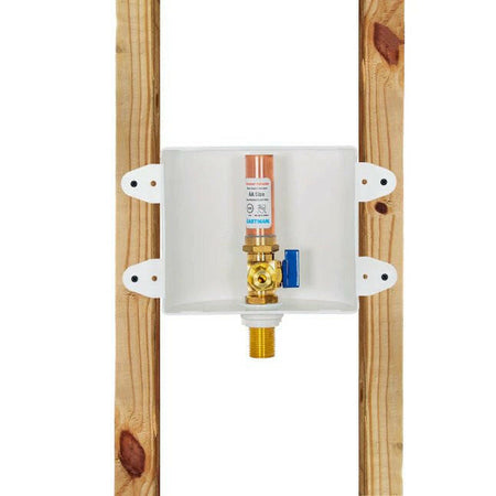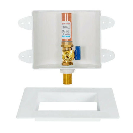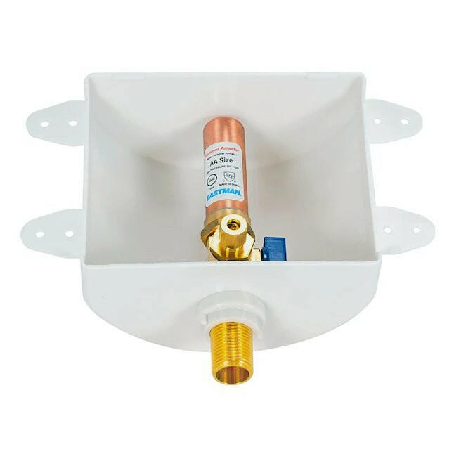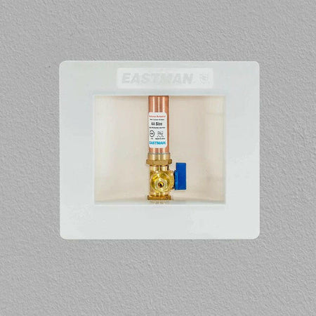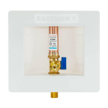 The Eastman® ice maker outlet box with hammer arrestor provides a safe water supply installation for refrigerators, water dispensers, and ice makers. It is built with a one-piece box and flange design. It comes with a pre-installed support bracket, a faceplate cover and a 1/4-turn ball valve for shut-off during maintenance with a hammer arrestor that prevents pipes from shaking and pounding. This ice maker outlet box has a 1/2-inch sweat inlet connection and a 1/4-inch outer diameter compression outlet. It is designed for recessed residential applications. Intended for service at temperatures between 34° F (1° C) and 180° F (82° C), with an allowable working pressure of 125 psi. Complies with lead-free law. UPC approved.