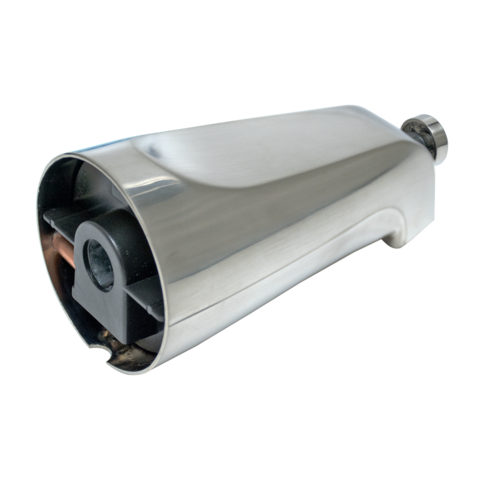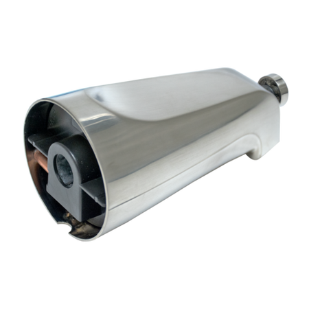 This diverter spout features a universal design. This spout is made of zinc construction for durability. The brushed nickel finish completes the look of your bathtub décor.