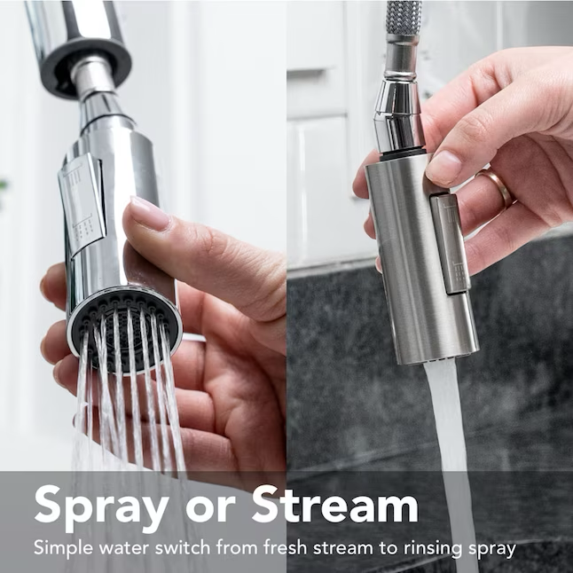 • Pull-down narrow spray allows you to go from fresh stream to strong rinsing spray