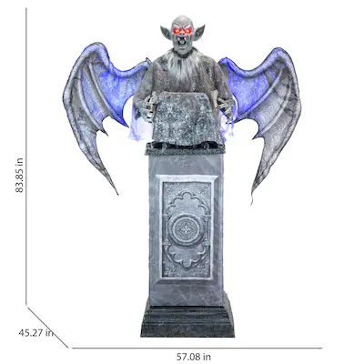 ANIMATED HALLOWEEN DECOR: 7-ft H x 4.8-ft x 3.8-ft D indoor animated graveyard gargoyle with sound and LED light effects on pedestal