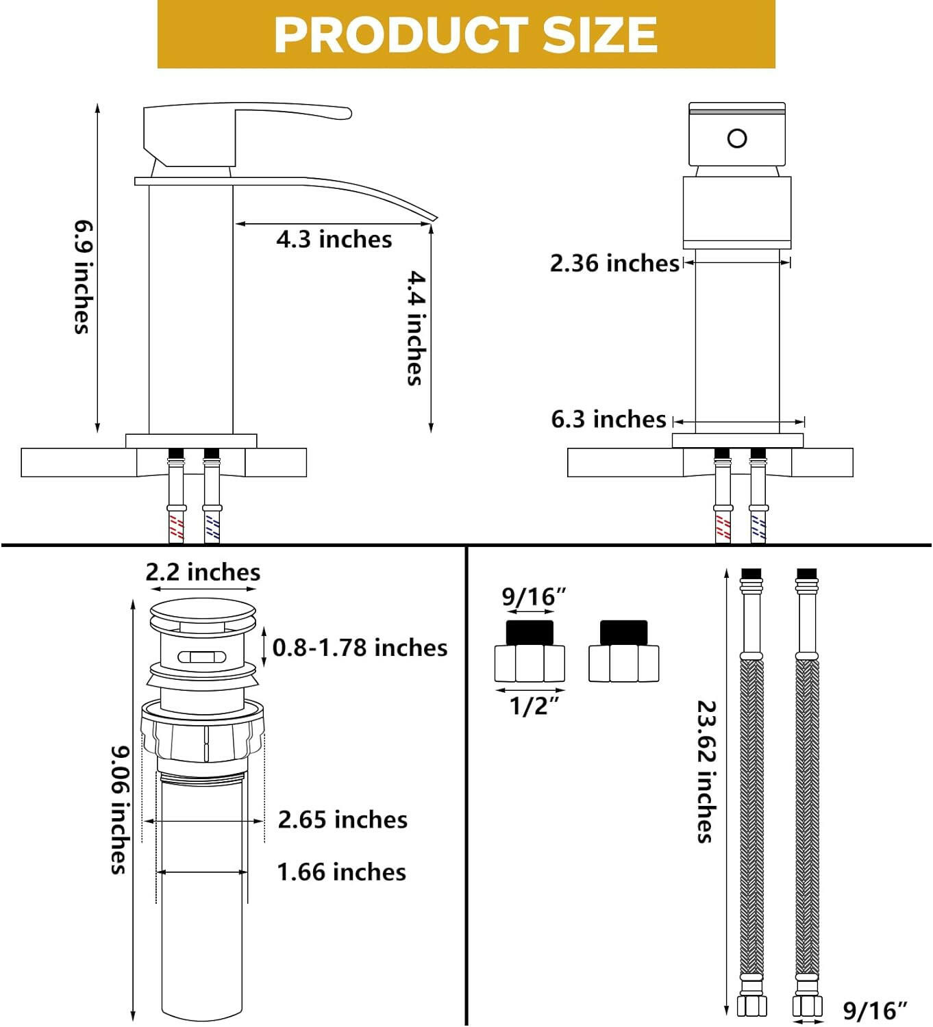 - 【The Most Easily Install Single Handle Bathroom Faucet】 Pop-Up Drain Included, 6" Deck Plate Included For 1 or 3 Holes 4-Inch Center Sink Installation. 2 Flexible Hoses (Hot and Cold), and Other Parts For an Easy Install.