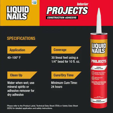 Liquid Nails Projects Construction Adhesive is a low-odor, VOC-compliant, latex adhesive for use with paneling, corkboard, molding and so much more. It bridges gaps up to 3/8 in. and creates a strong, lasting, waterproof bond when set. Easy gunning and generous working-time make it simple to use and it cleans up with water while still wet.