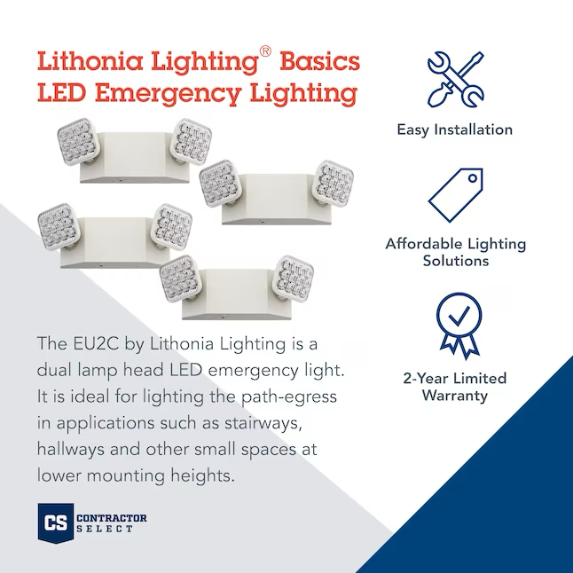 The EU2C Pack of 4 by Lithonia Lighting® is a dual lamp head LED emergency light. Certified Title 20 for small battery charger systems, the EU2C provides emergency lighting while saving energy. It is ideal for lighting the path-of-egress in applications such as stairways, hallways and other small spaces at lower mounting heights.