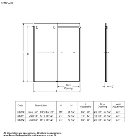 Fits showers with 55-1/2-inch high wall clearance, glass extends to 59-inch