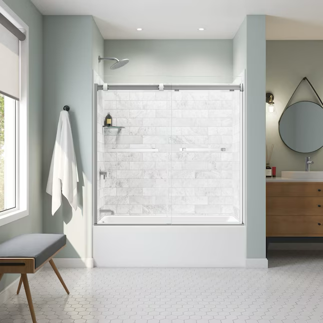 - Specifications ADA Compliant No Installation Type Alcove Bypass Yes Door Opens Reversible Mounting Style Track sliding Door Type Sliding Number of Doors 2 Frame Type Semi-frameless Privacy No Glass Pattern Name Clear Soft Close No Glass Style Clear Towel Bar Included Yes Grid Style No Trackless No Handle Style Bar Water-Repellent Coating Yes Hardware Included Yes