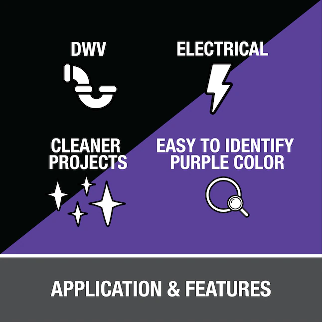 - Features Application PVC cement and primer Manufacturer Color/Finish Purple and Clear Low VOC Yes Series Name Handy Pack