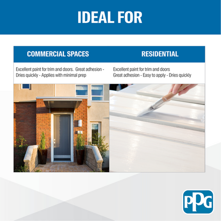 PPG Break-Through Interior and Exterior Door, Trim and Cabinet Paint and is an ultra-durable waterborne acrylic enamel paint with excellent flow and leveling, outstanding early block resistance and very fast dry. This paint can be used for interior/exterior applications and on both horizontal and vertical surfaces. Ideal for use on doors, windows, trim & cabinetry; shelving, fixtures, railings, concrete floors and safety markings, in residential, commercial and institutional settings. PPG Break-Through Interior and Exterior Paint offers excellent adhesion to difficult substrates, including fiberglass, ceramic tile, laminate, and architectural plastics and endures extreme bends and deformation without cracking or peeling.