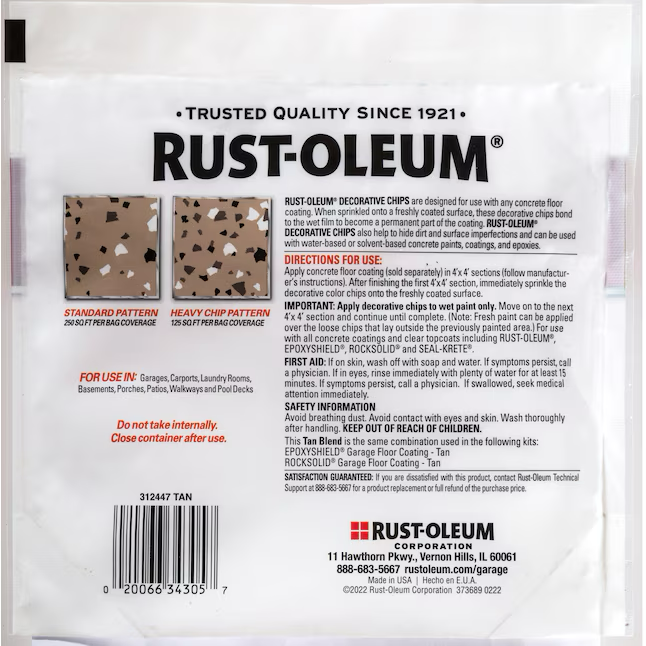 Rust-Oleum decorative color chips are a special blend of vinyl chips designed specifically for use with garage floor coatings