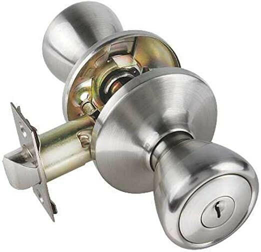 Steel harbor entry lock tulip knob satin nickel, includes 2-3/8 inch - 2-3/4 inch adjustable Backset kW1 Keyway random keyed bilingual clamshell packaging satin nickel
