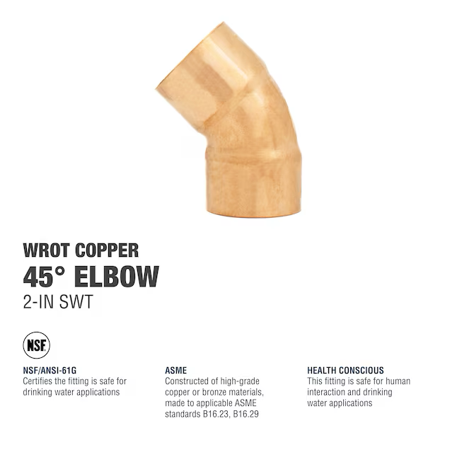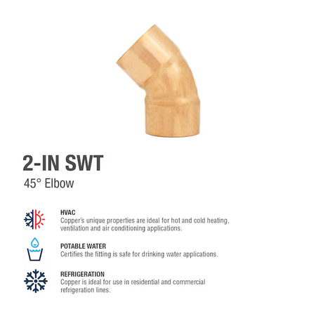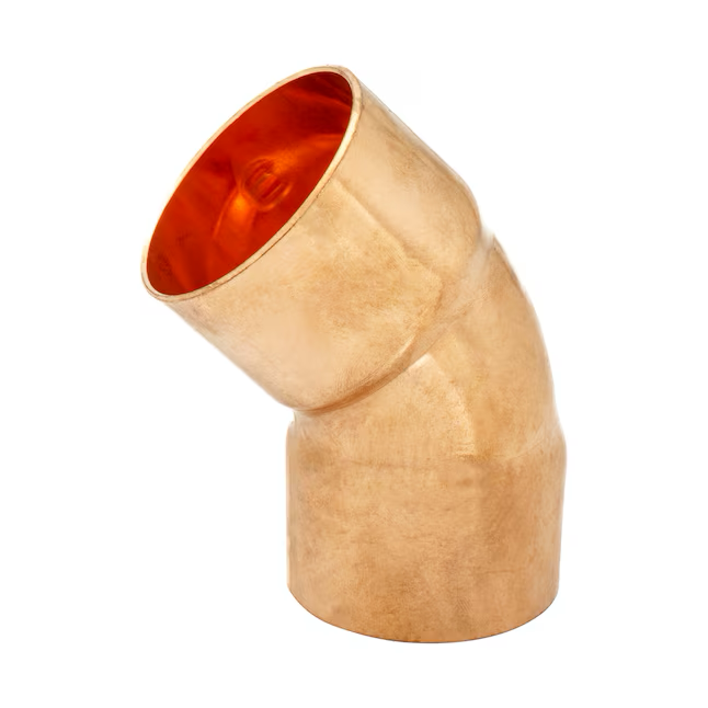 • Specifications Connection Type (End 1) Cup (Solder) Maximum Working Pressure (PSI) 594 Connection Type (End 2) Cup (Solder) Maximum Working Temperature (Fahrenheit) 250 Connection Type (End 3) N/A Minimum Working Temperature (Fahrenheit) -40 Degree of Angle 45 Package Quantity 1 Fitting Type Solder Permanent or Removable Permanent