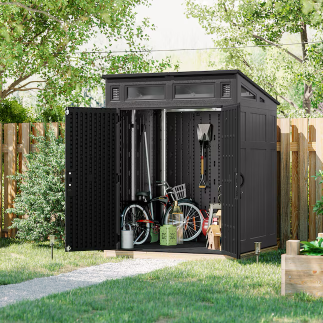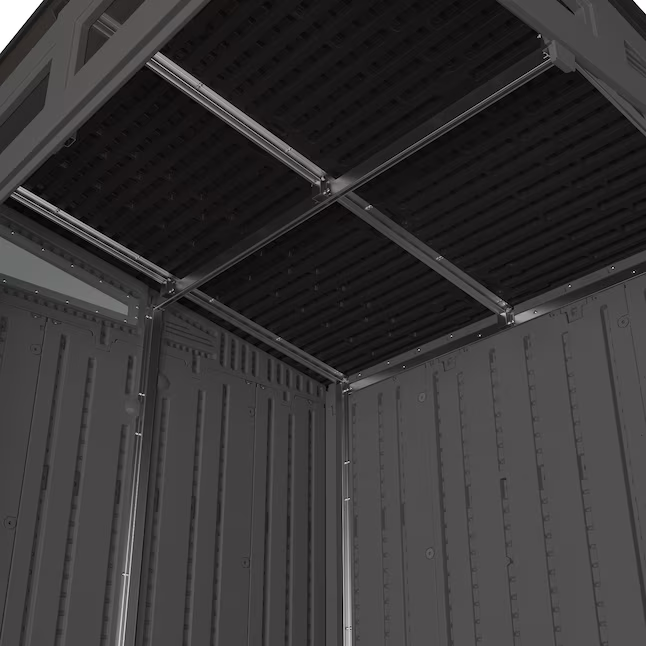 A combination of strength and storage, the 6 ft. x 5 ft. Modernist® Storage Shed by Suncast® is the perfect fit for anyone looking to upgrade their storage capabilities. Featuring 200 cubic feet of storage space this shed is ideal for storing all your outdoor equipment. A steel frame structure and multi-wall resin panels provide maximum strength and durability, even under heavy roof snow loads. Sturdy double doors allow you to access your items easily, and the doors are pad-lock ready for added security (lock not included). Large transom windows allow for natural light making it easy to find what you need. This shed is beautiful, strong and built to withstand the elements all year long.