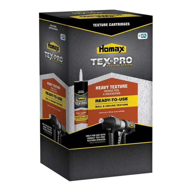 Only for use with Homax TexPro Sprayer (Sold Separately). Homax TexPro Orange Peel and Knockdown Heavy Wall and Ceiling Texture is up to 70% faster and 60% lighter than a traditional hopper gun. Homax TexPro Texture System makes a tough job simple, with a lightweight, comfortable and innovative design, applying texture is now a breeze. Simply hook the sprayer up to an air compressor (sold separately), load the ready mix texture cartridge and pull the trigger.