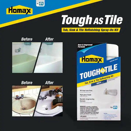 Homax Tough as Tile Tub and Sink, 1-Part Epoxy Finish restores your tub or sink to a like-new condition. It is specially formulated to provide a hard, high-gloss and protective finish that remains beautiful for years. No need to hire a contractor or replace expensive fixtures. Do it yourself with Homax Tough as Tile and save hundreds, even thousands of dollars on your bathroom refresh.