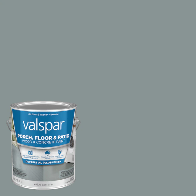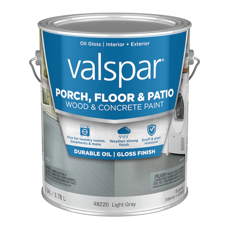 Valspar® Porch, Floor and Patio Oil Paint protects floors with beautiful, rich colors. Glides on and dries quickly to a hard, glossy finish resisting scuffs, scrapes and scratches on exterior wood and concrete floors.